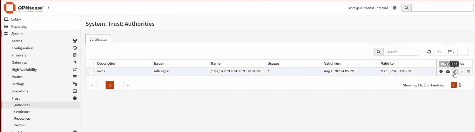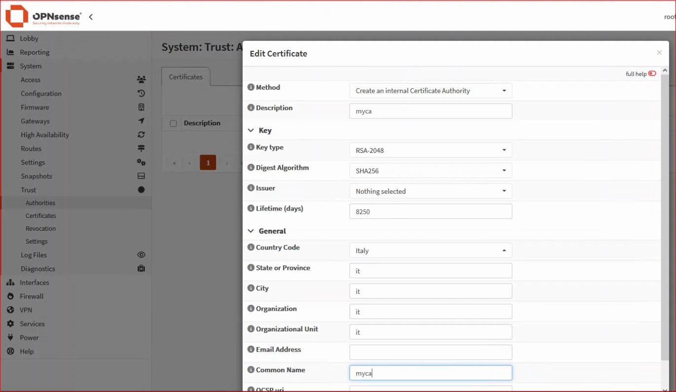 Dal menu scegliete System→Trust→Authorities e configurate una CA interna.