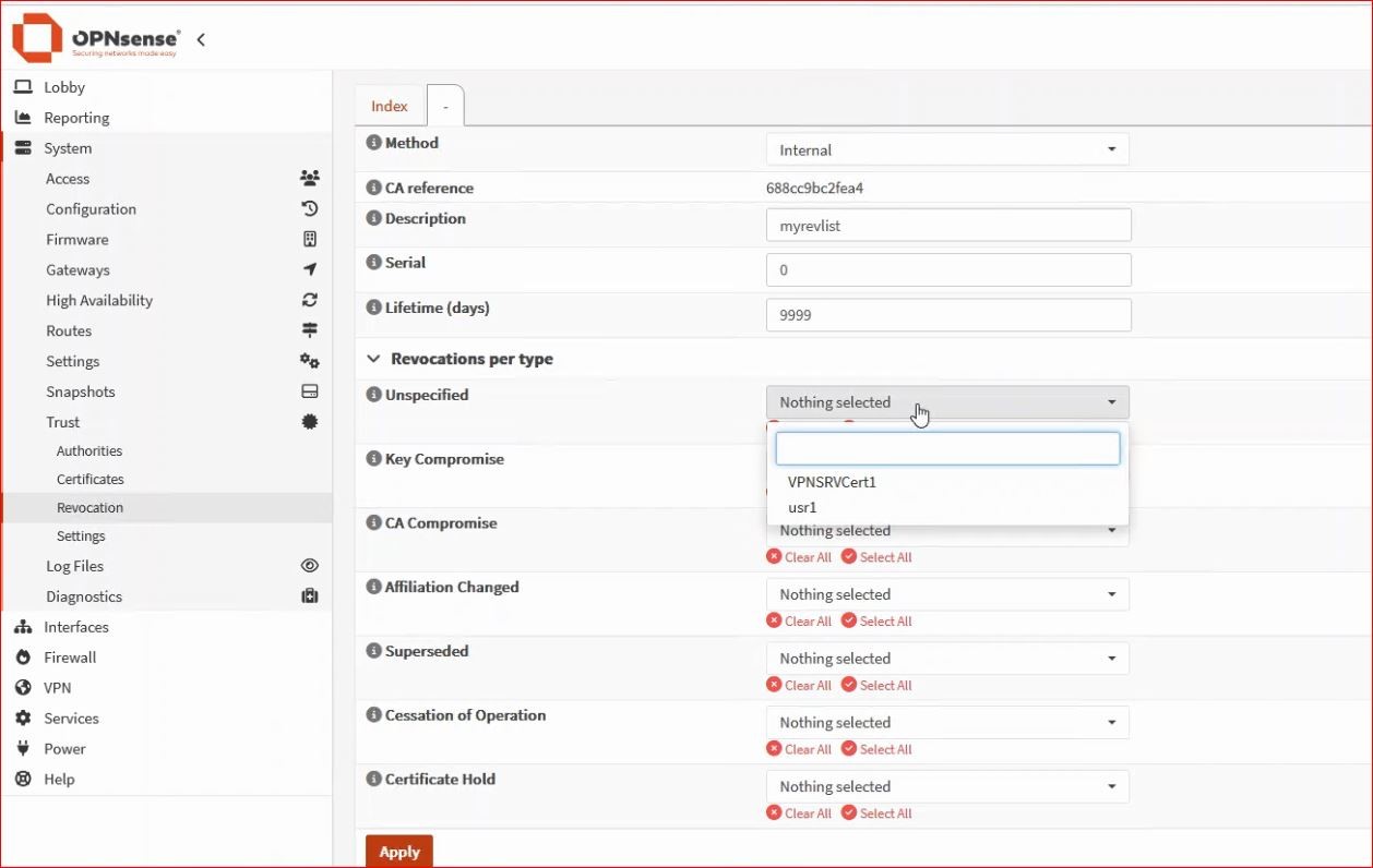 – Posso anche creare una lista di revocation list da system→Trust→ Revocation e faccio un edit della CA utilizzata nel server Openvpn (non volendo revocare alcun certificato posso lasciare Nothing selected)
