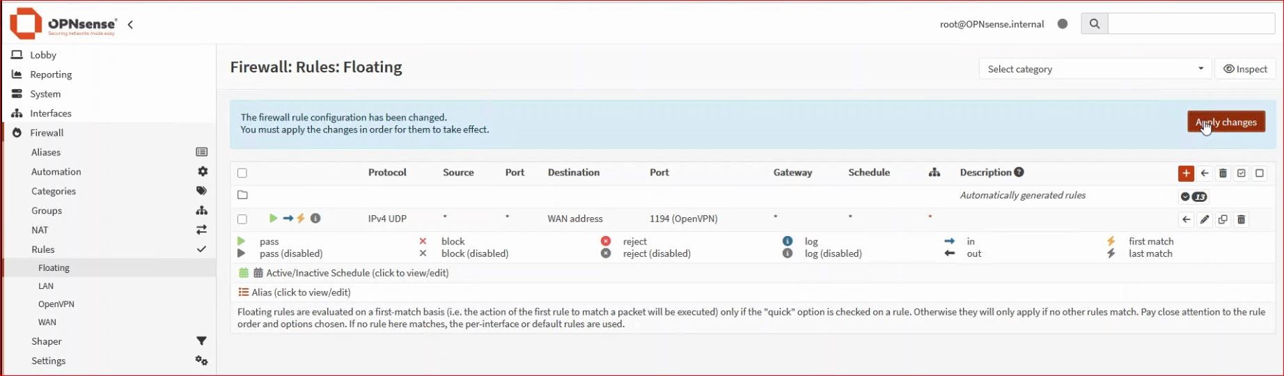 Un modo per permettere il collegamento al server OpenVPN sta nel creare una regola in firewall→rules→ floatting, nel nostro esempio devo permettere l’accesso sulla WAN alla porta UDP 1194.