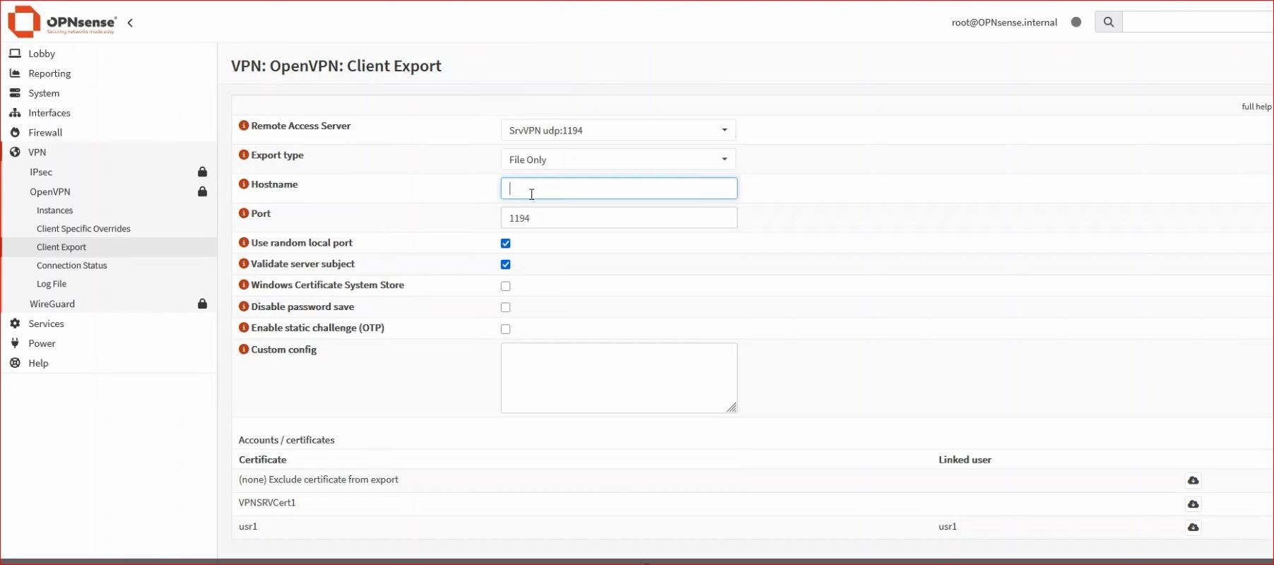OpnSense ha l’utility client export inclusa. Nel campo Hostname dovete mettere l’ip oppure l’FQDN che punta all’IP pubblico con cui potete raggiungere il firewall sulla WAN.