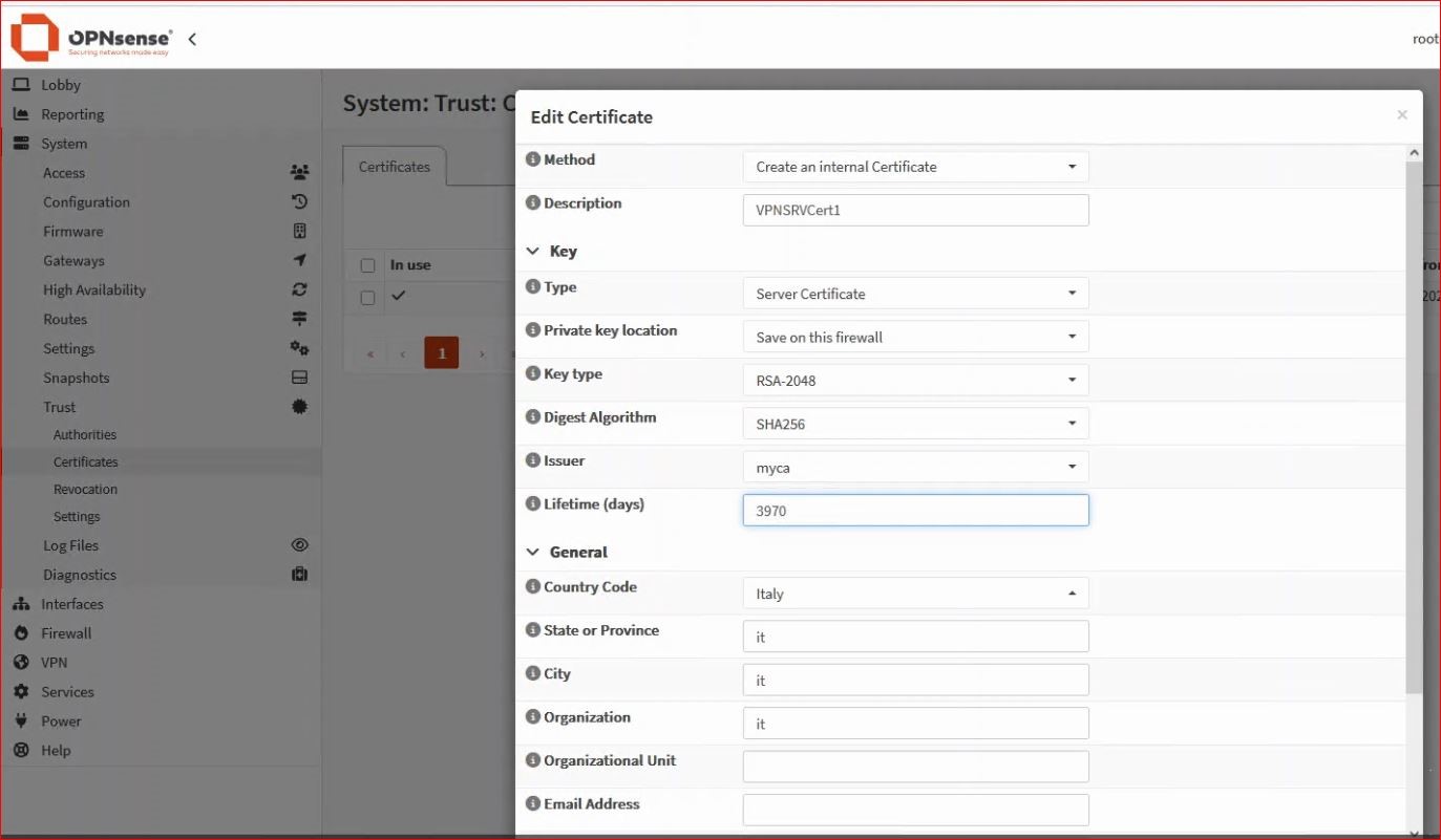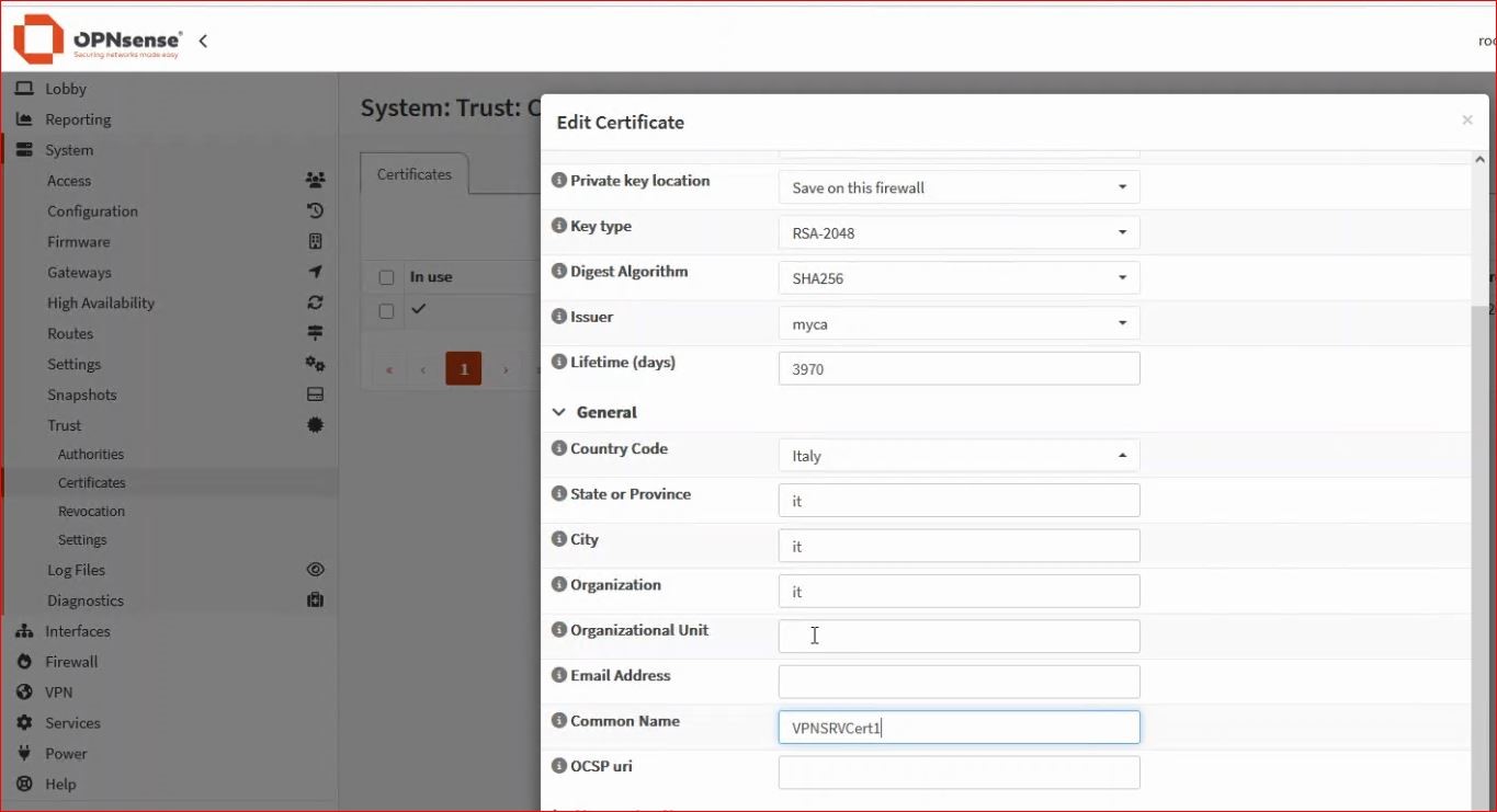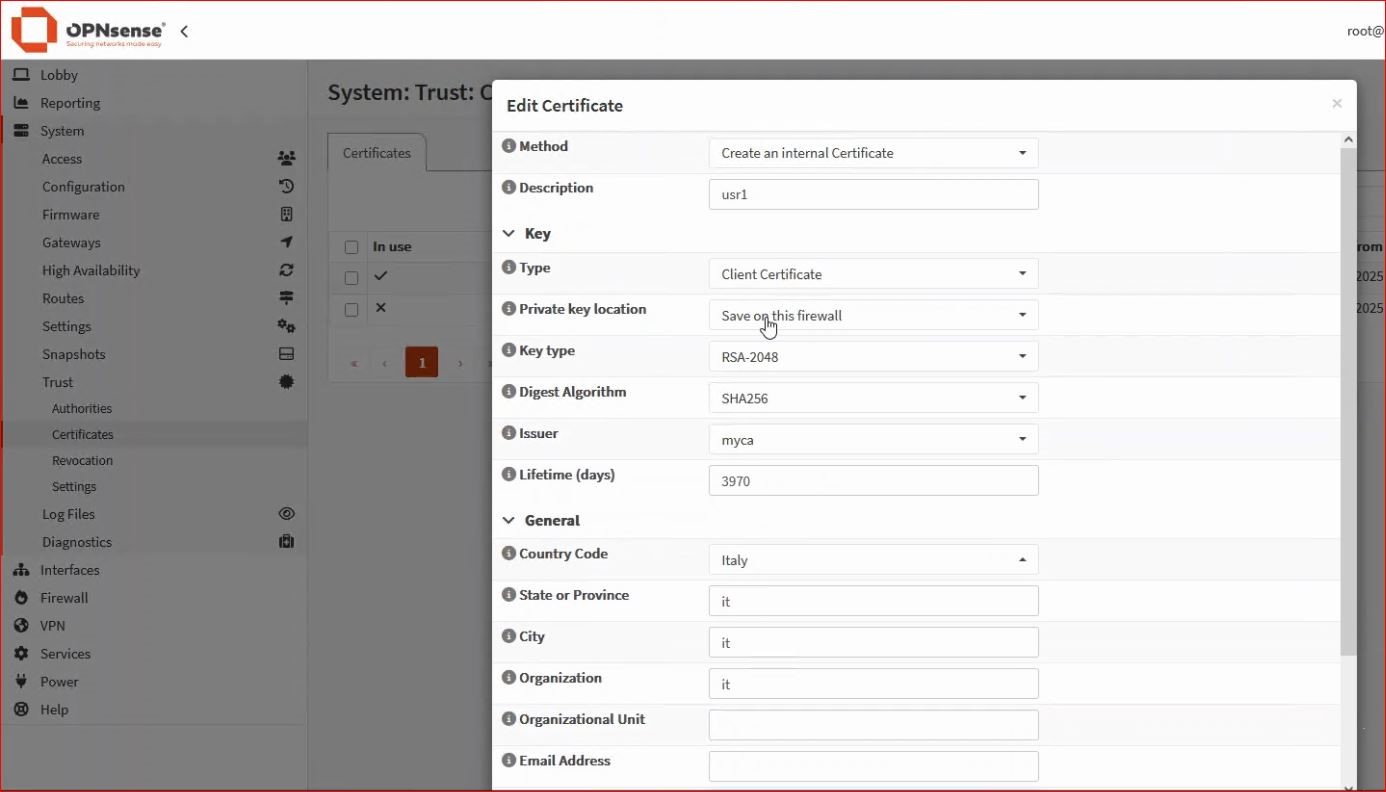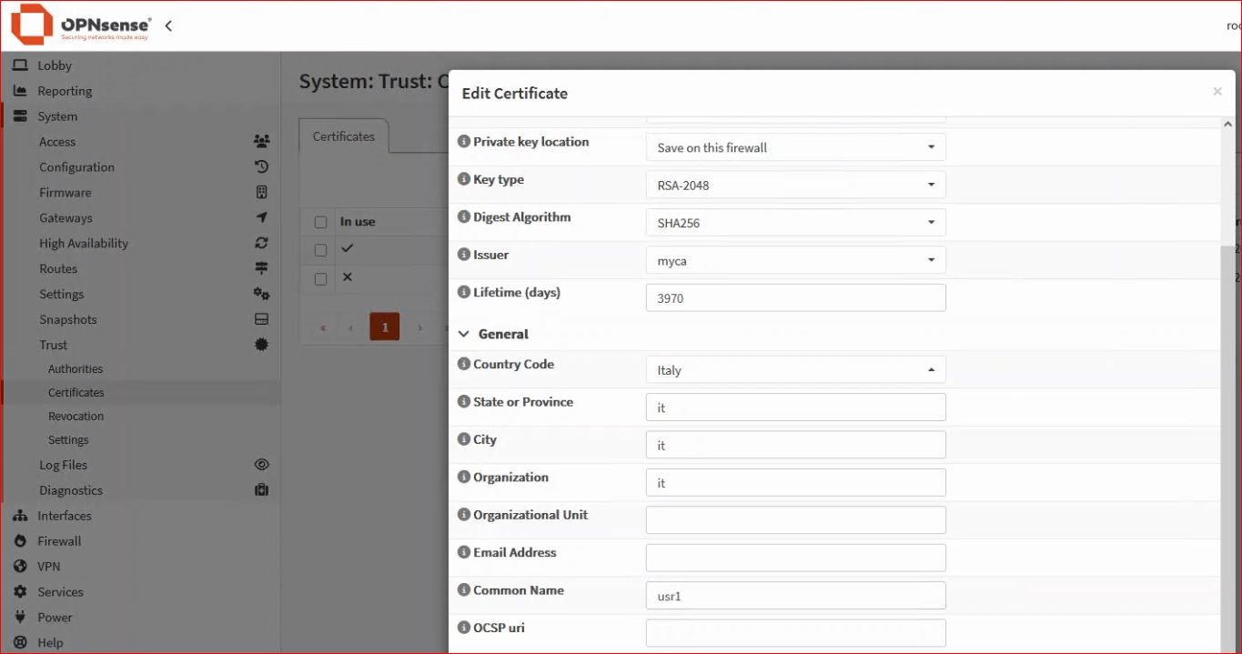 Dal menu scegliete System→Trust →Certificates e aggiungete un internal certificate – Client Certificate