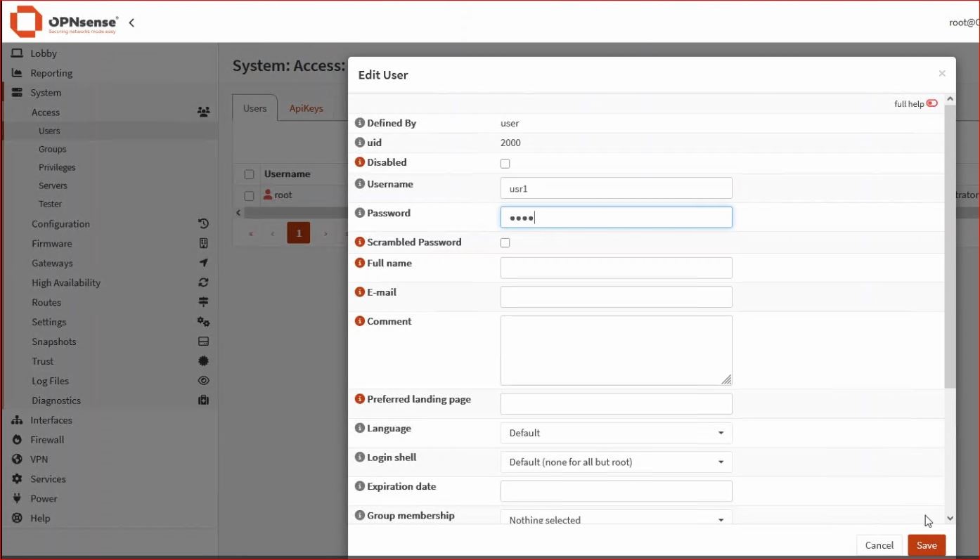 Dal menu scegliete System→Users e quindi aggiungere un utente (in questo esempio usr1)