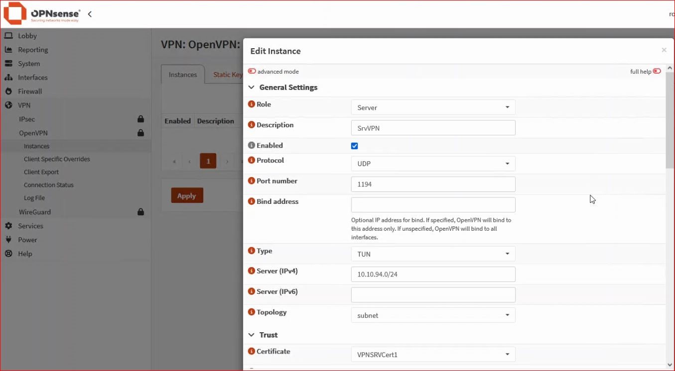 Dal menu VPN→OpenVPN→Instances aggiungo l’istanza server OpenVPN.